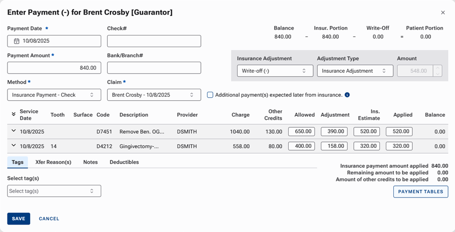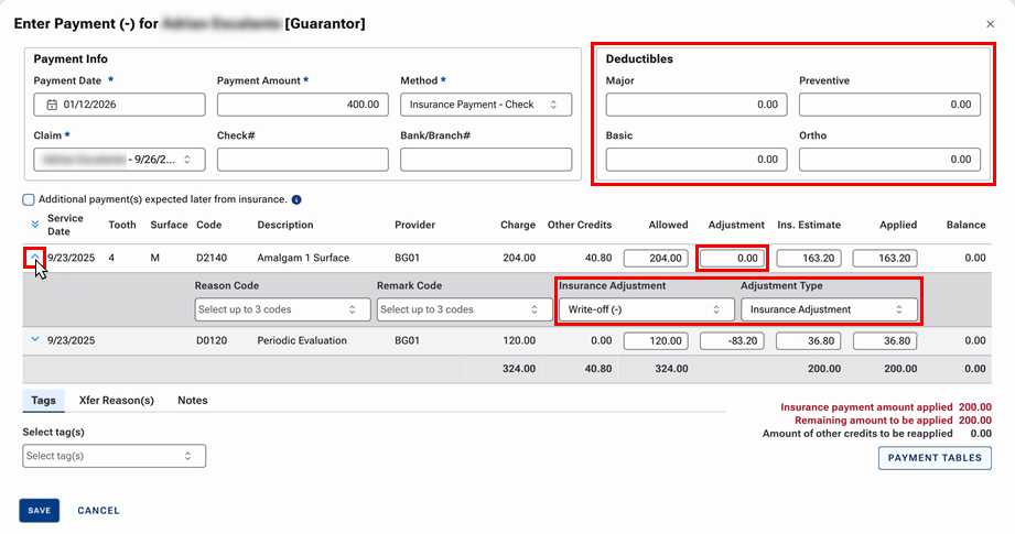 Previously, you could specify an adjustment amount per procedure, but you could select only one type of insurance adjustment (“Write-off” or “Offsetting”) and one adjustment type (such as “Insurance Adjustment”).