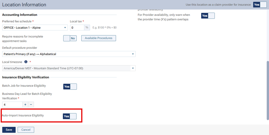 For each location, open the Location Information page (Settings > Location Information), set the Auto-Import Insurance Eligibility switch to Yes, and then click Save.