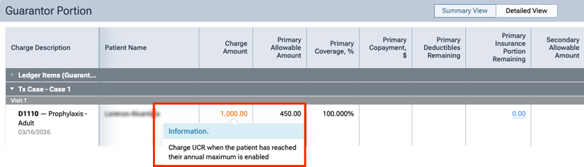 If a patient has an applicable insurance carrier and has reached his/her annual maximum, in the Detailed View of the patient’s treatment plan preview or ledger, the Charge Amount is displayed in orange text. You can click the amount (which is a link) to view a message, which states that the patient is being charged the UCR fee because his/her annual maximum has been reached.