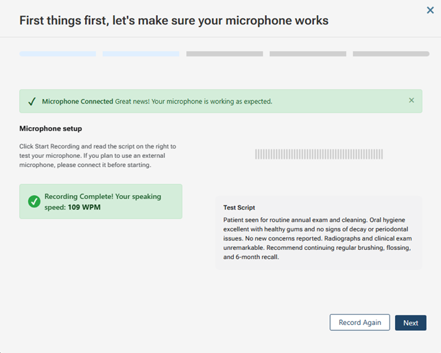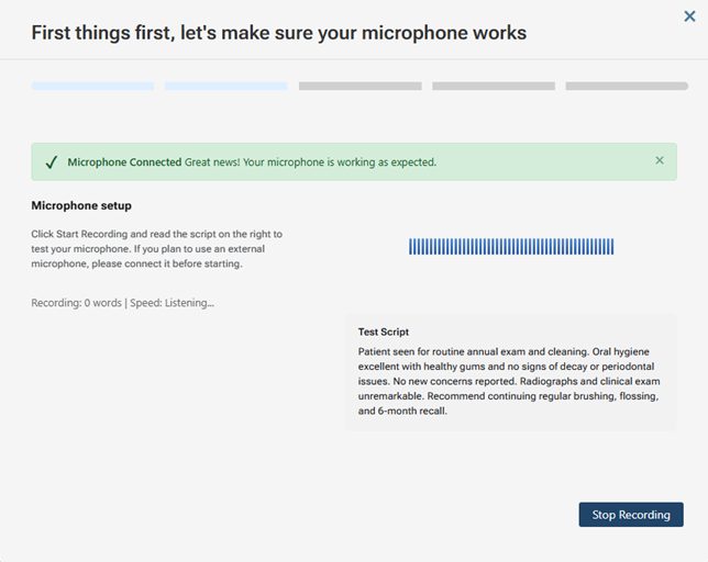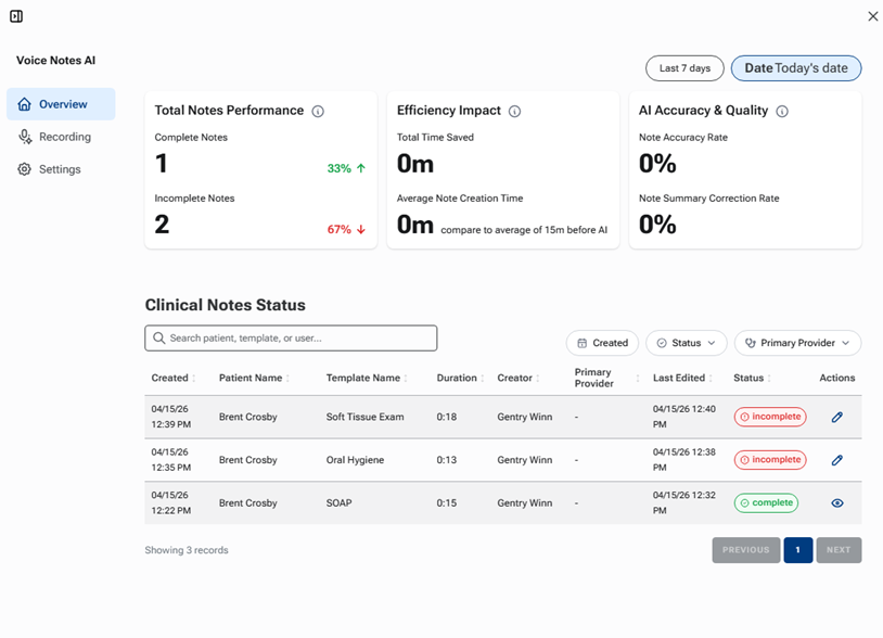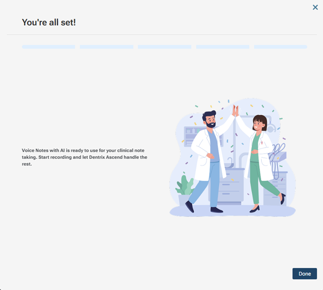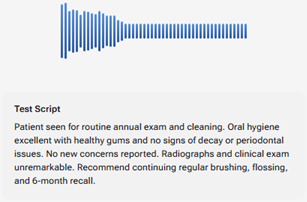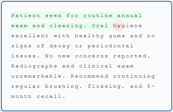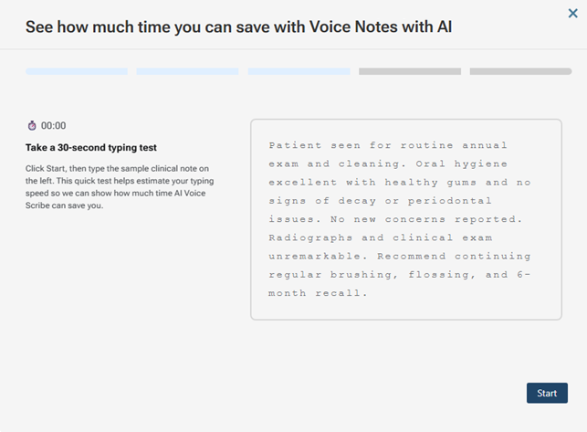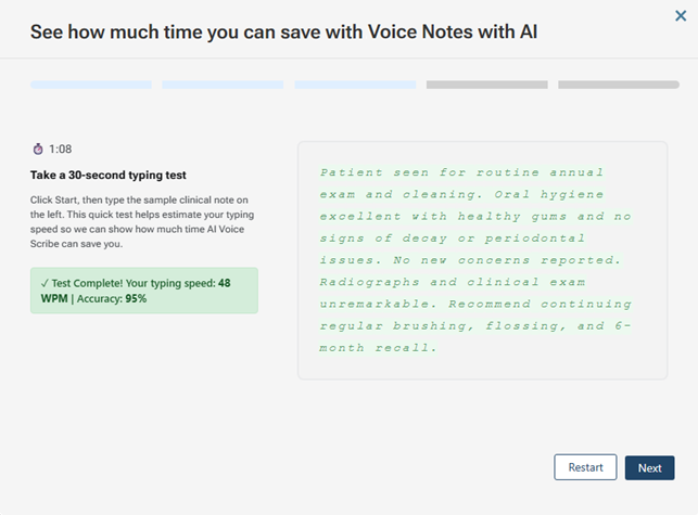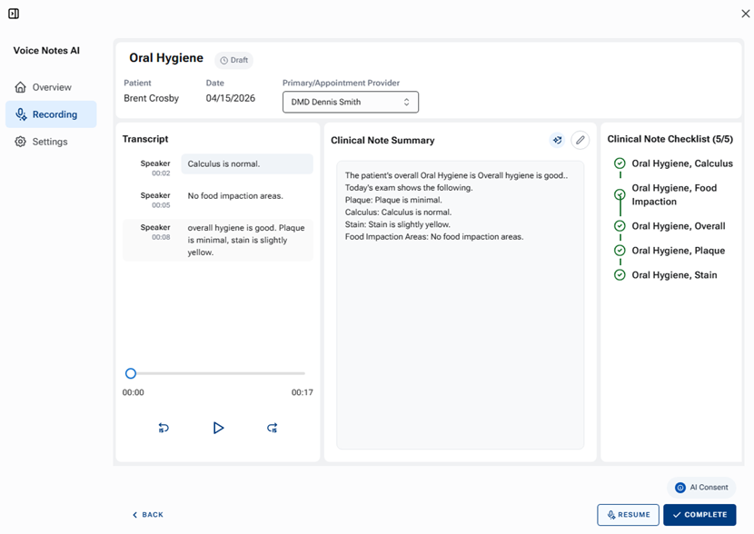 Dentrix Ascend Voice Notes is an AI-assisted note taking feature that allows you to capture full exams in real-time and automatically write structured clinical notes directly into Dentrix Ascend. Voice Notes effortlessly turns spoken interactions into accurate notes, reducing paperwork and improving record accuracy, allowing dentists to focus more on patients. Turn after-visit dictation into structured notes in seconds with Voice Notes—faster than typing, with fewer missed details. A real-time checklist during dictation ensures everything is captured, and saved to the chart, reducing claim rejections and rework.