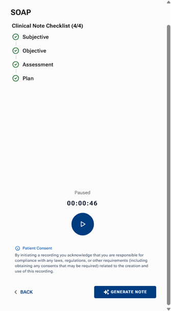When you are done dictating, pause the recording by clicking the pause icon (the icon changes to a play icon), and then click Generate Note.