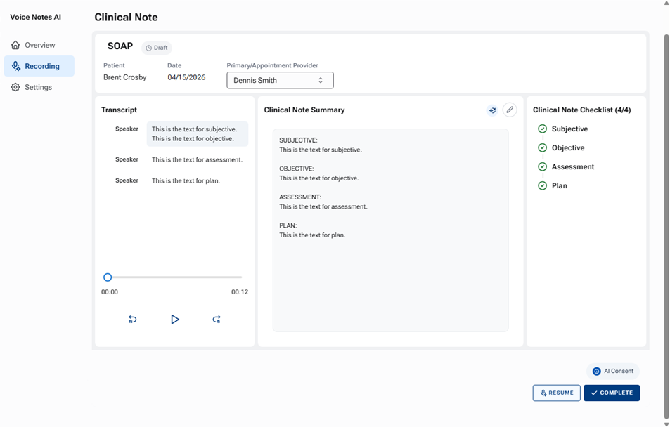 With Voice Notes, you can dictate clinical notes using a microphone, view a summary of your clinical notes, and edit clinical notes. You can also change audio settings as needed.
