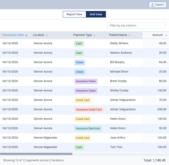 This view lists each payment by transaction date. You can sort the list by any of the available details (such as location or payment type). A total of all payments in the list appears at the bottom.