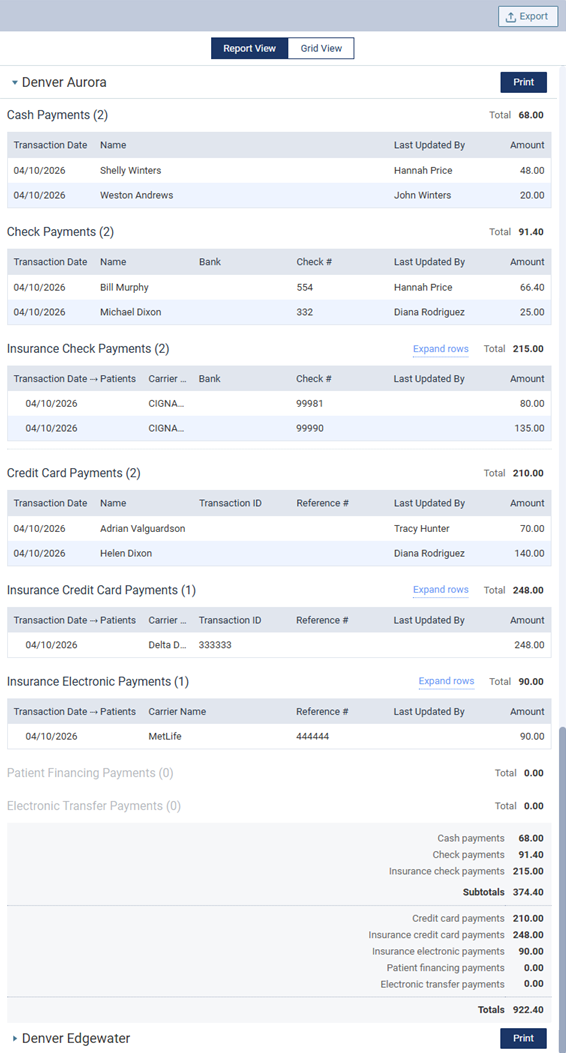 - If multiple locations are selected, the payments and totals are grouped by location.
