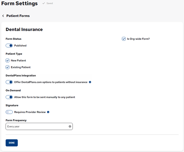 The Form Settings dialog box for patient forms has been redesigned to better help you understand how patient forms are delivered so you can avoid configuration errors.