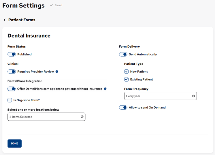 - Allow to Send On Demand – Determines if the form can be sent on demand. The switch was renamed from “Allow this form to be send manually to any patient” and moved here.