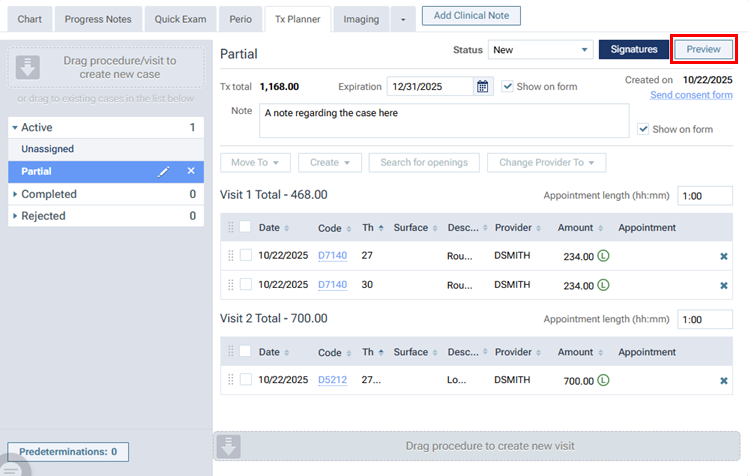 1. On the Tx Planner tab of a patient’s clinical record, select a case, and then click Preview.