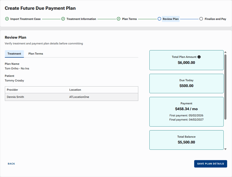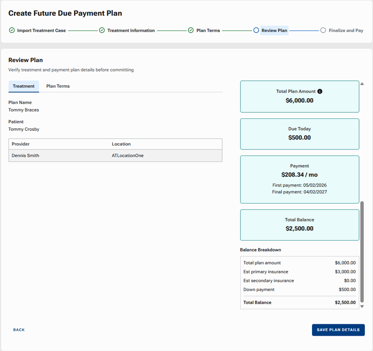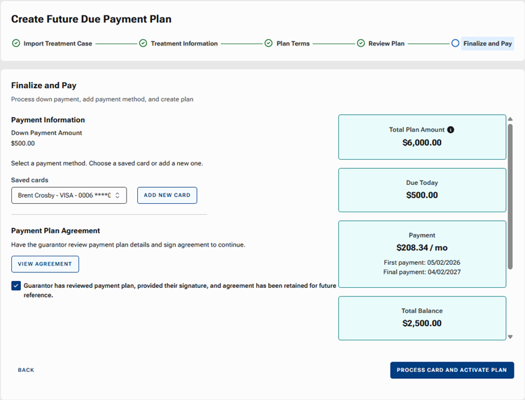 Also, a dedicated dashboard provides clear insight into active plans, upcoming charges, completed payments, failed card retries, and overall plan status. By reducing manual billing tasks and improving cash‑flow predictability, future due payment plans help practices manage long‑term patient balances more efficiently and deliver a consistent, reliable payment experience for orthodontic patients.