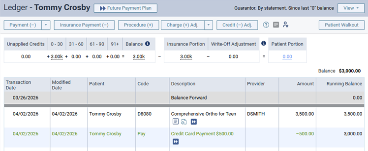 Future due payment plans represent a meaningful enhancement over the standard payment plans in Dentrix Ascend. Standard payment plans can only be created for balances that have already been fully charged to the ledger, requiring all production to be posted upfront. Future due payment plans work differently—charges are applied incrementally through down payments and monthly payments. This model aligns more naturally with provider production, reduces large upfront aging balances, and improves financial accuracy across extended ortho treatments.