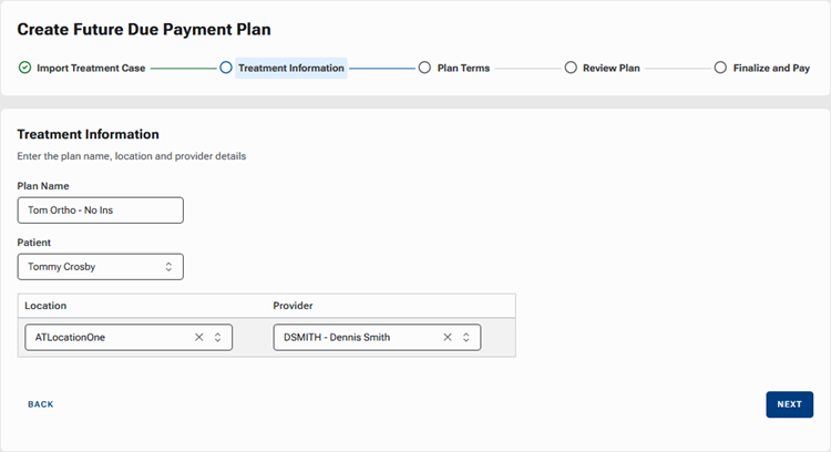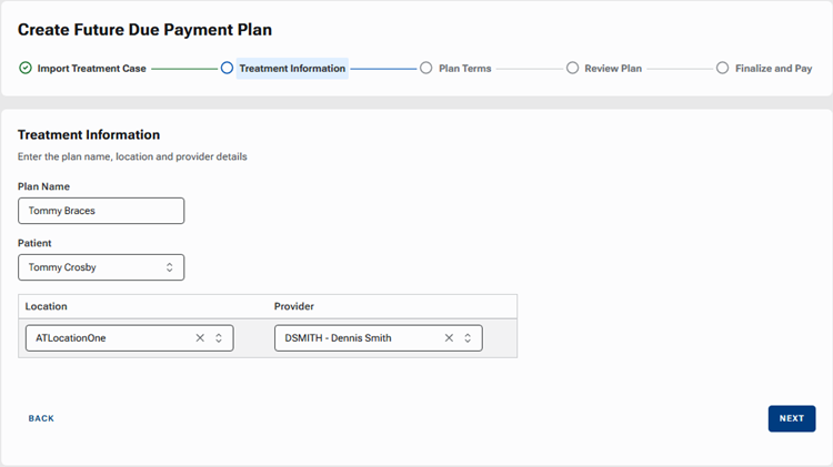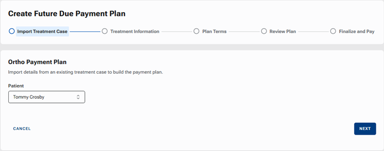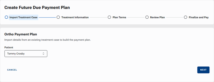 The Create Future Due Payment Plan page opens. The Import Treatment Case step is selected.