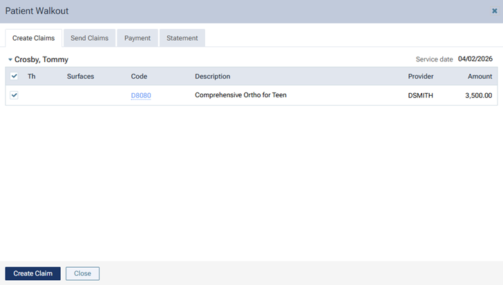 5. On the Create Claims tab, select the ortho procedure, and then click Create Claim.