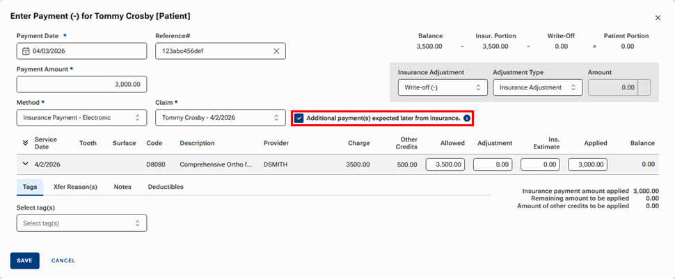 Note: When you enter the insurance payment for a claim with an ortho procedure, the Additional payment(s) expected later from insurance checkbox is selected automatically.