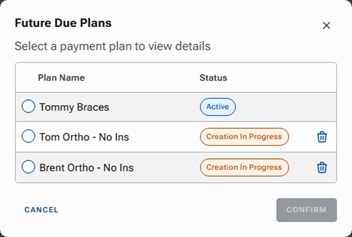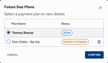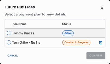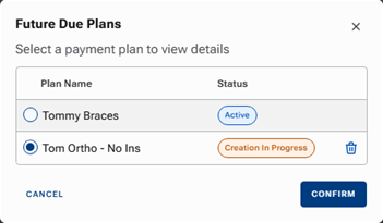 2. If the patient has multiple future due payment plans (or if the account has multiple, and you are viewing the guarantor’s ledger), select a plan with a “Creation In Progress” status, and then click Confirm.