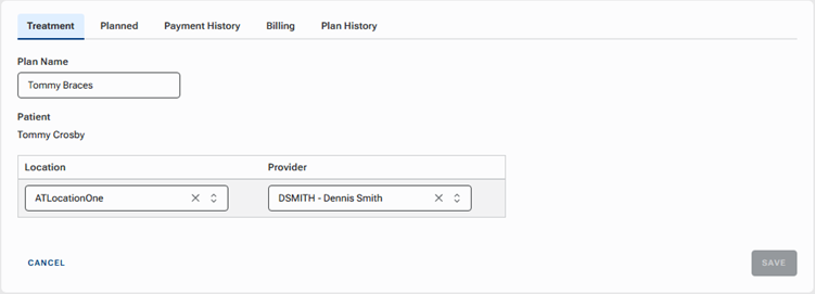 The Treatment tab displays the plan name, patient name, location, and provider.