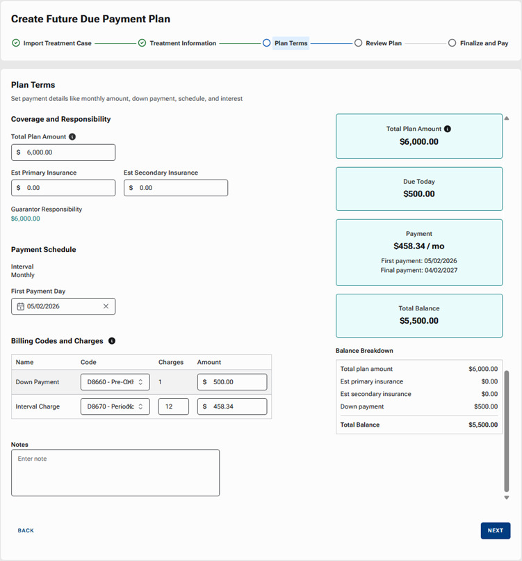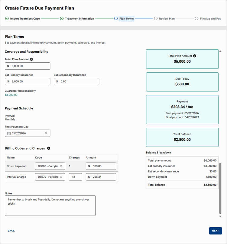 Note: As you complete these fields in this step, the Total Plan Amount, Due Today, Payment, and Total Balance (the blue boxes on the right) and the Balance Breakdown (below the blue boxes on the right) update automatically.