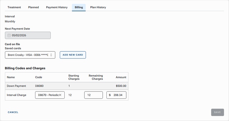 The Billing tab displays the date of the next payment, card on file for the plan, procedure billing codes, charge amounts, and remaining number of payments.