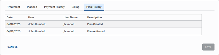 The Plan History tab displays an audit log of events related the plan, such as creation and activation.