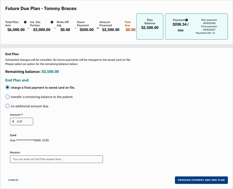 With this option selected, enter an Amount to charge the card on file, enter a Reason for ending the plan (optional), and then click Process Payment And End Plan.