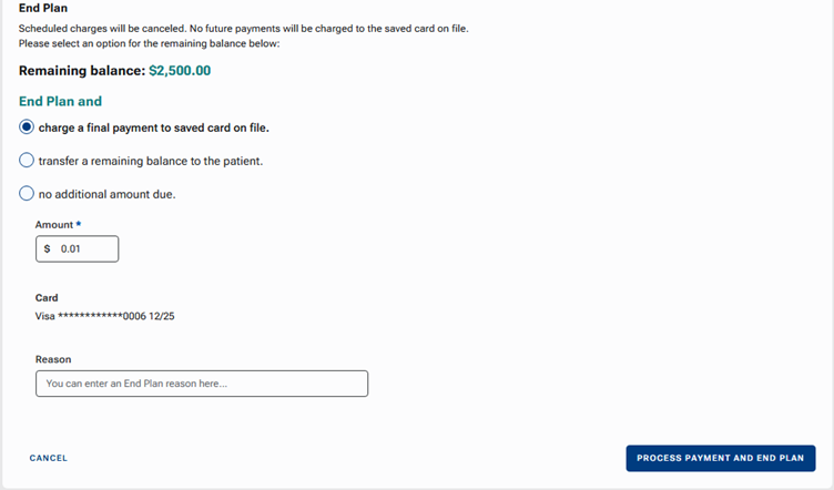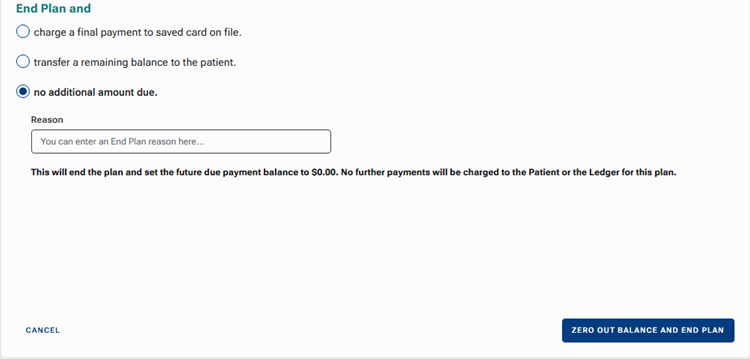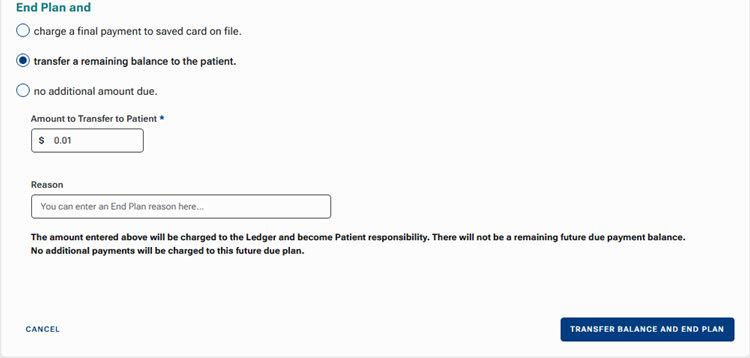 With this option selected, enter the Amount to Transfer to Patient (without charging the card on file), enter a Reason for ending the plan (optional), and then click Transfer Balance And End Plan.
