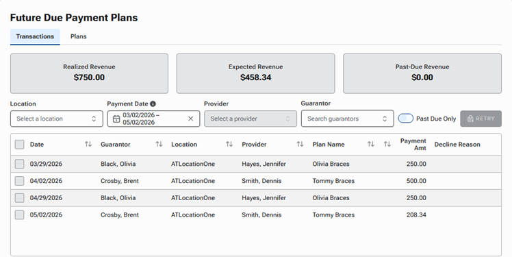 By default, transactions are displayed from one month in the past through one month in the future. The date range can be adjusted but is limited to a maximum total range of two months. Use filters to focus on specific locations, providers, or guarantors; or use filters to quickly identify past‑due payments.