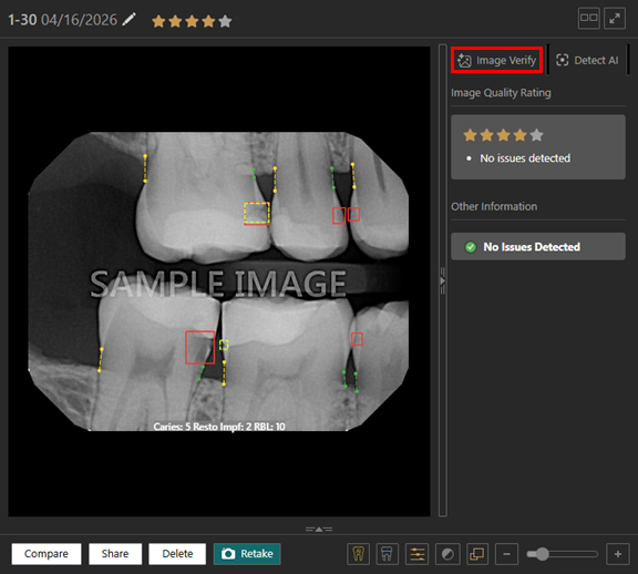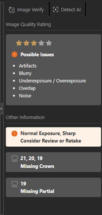 With Detect AI enabled, while you are viewing an image, the details that appear on the Image Verify tab of the AI panel (on the right) have been enhanced. On the Image Verify tab, the Image Quality Rating and Other Information are presented separately. The star-based image quality rating appears with contextual issue messaging so you can quickly and confidently assess image quality without ambiguous guidance. Based on the star rating of an image, the messaging that appears clearly explains the detected quality concerns or confirms that no issues were found.
