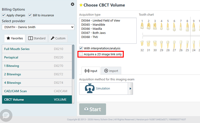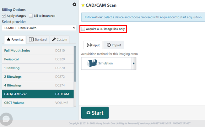 Now, for both CBCT Volume and CAD/CAM Scan acquisitions, the Acquire a 2D image link only checkbox is clear by default.