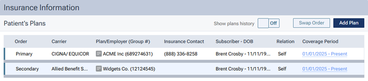 When a patient has primary and/or secondary dental insurance on file in Dentrix Ascend, that insurance information is pre-filled on any patient forms that have a section for entering insurance information, so the patient does not have to enter insurance information each time those forms need to be completed.