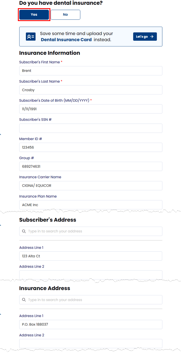 The patient accesses the form online and selects Yes to the question about having dental insurance. The subscriber and insurance details are pre-filled for the primary plan.