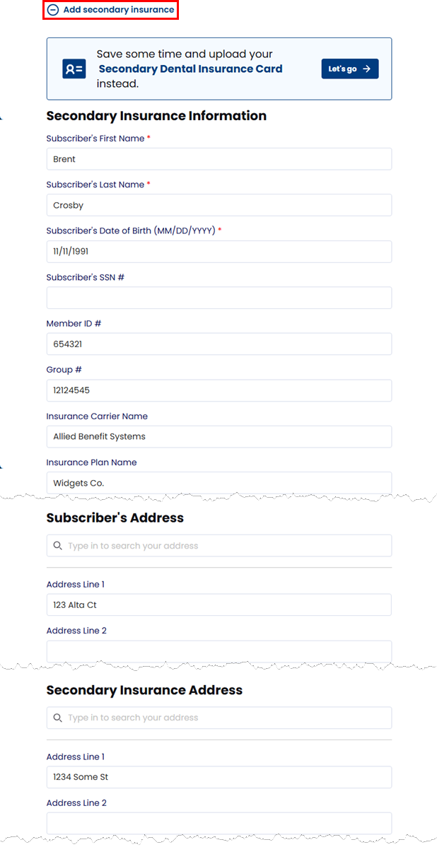 The patient selects the Add secondary insurance option. The subscriber and insurance details are pre-filled for the secondary plan.