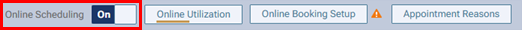 If your organization did not use the legacy online booking service prior to April 22, 2026, your locations have been switched automatically to the new online scheduler (the Online Booking switch is no longer available). You use the Online Scheduling switch to enable or disable online scheduling and perform other configuration steps. Do the following: