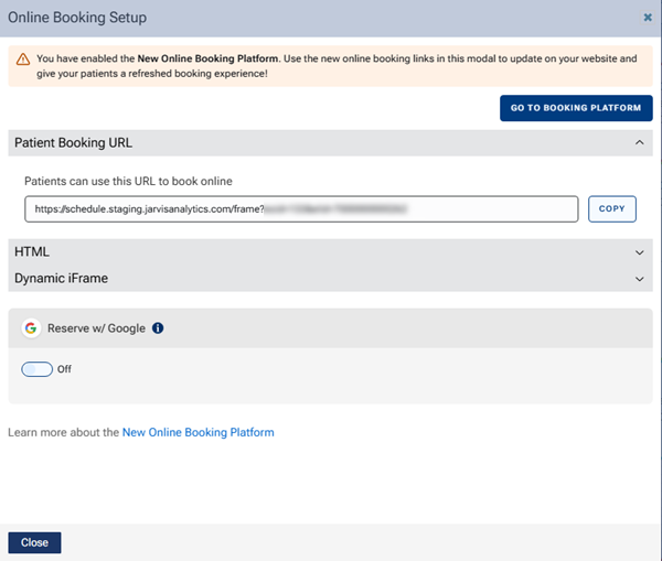 - With the Upgrade to the new Online Scheduler switch turned On, the Online Booking Setup dialog box displays the options for the new online booking service.