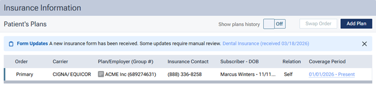 After a patient has provided subscriber and insurance information on an online form, on the patient’s Insurance Information page, a notification, stating that a new patient form with insurance information is available, now appears.