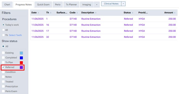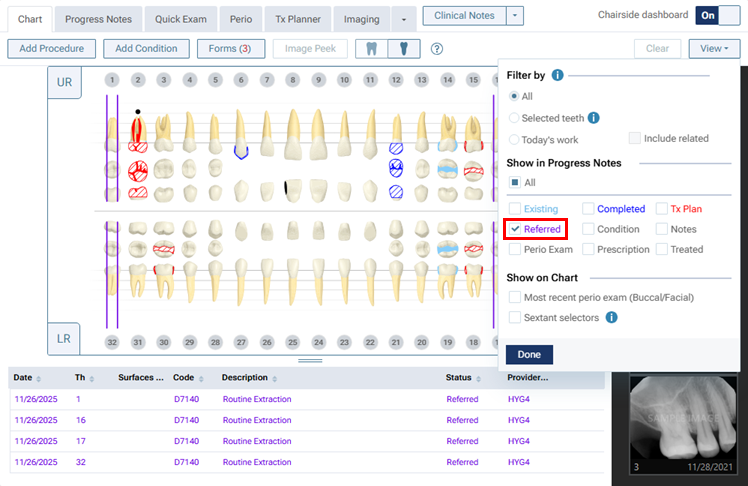While using the chairside dashboard, you can filter the progress notes to show or hide referred procedures, which appear in a purple color.