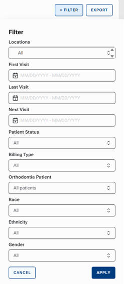 Supports common filtering scenarios across visit history, demographics, billing attributes, and patient status.