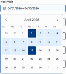 Next Visit – To include patients whose next visit date is a specific date or a date in a specified range, select a date or the starting and ending dates on the calendar. Note: To remove a specific date, click it on the calendar to deselect it. To remove a date range, click the first date of the range to deselect the last date of the range, and then click the same date again to deselect it.