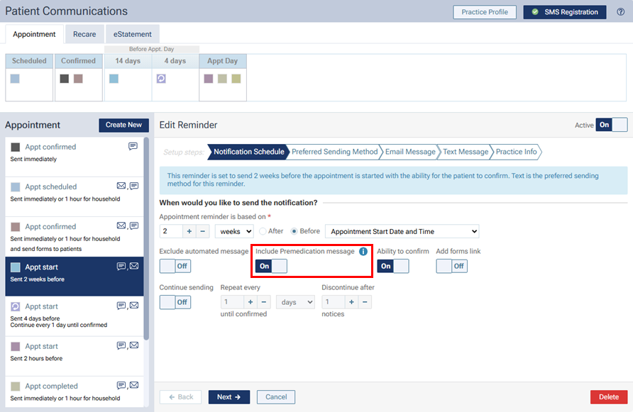To include a premedication message to an existing reminder, on the Patient Communications page (go to Settings > Patient Communications), select an appointment reminder, and then set the Include Premedication message switch to On.