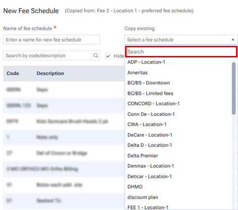 On the Fee Schedules page (Settings > Fee Schedules), when you are creating a new fee schedule (by clicking Create New) and want to select a fee schedule from the Copy existing list, there is now a Search box to help you quickly locate the fee schedule from which you want to copy fees to populate the new fee schedule. In the Search box, begin typing part of a fee schedule’s name to view the matching fee schedules. Continue typing as needed to narrow down the list of results.