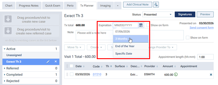 On the Tx Planner tab of a patient’s clinical record, for a treatment case, you can now set the Expiration date to 3 Months.