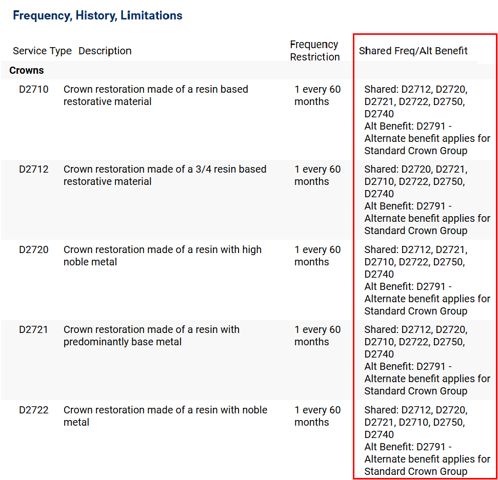 - For a given code, any codes that have the same frequency limitation as that code. For example, a D2710 (resin-based crown) may have the same frequency limitation as a D2712 (3/4-resin-based crown).