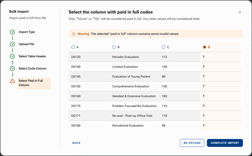Note: If the import tool detects blank or invalid values in the selected column, a message appears. Those procedures will not be marked as “Paid in Full.”