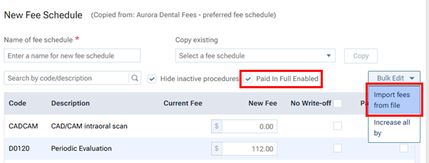 Go to Settings > Fee Schedules to open the Fee Schedules page, click Create New, enter a name for the fee schedule, select the Paid in Full Enabled checkbox, expand the Bulk Edit menu, and then select Import fees from file.