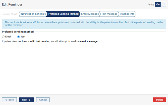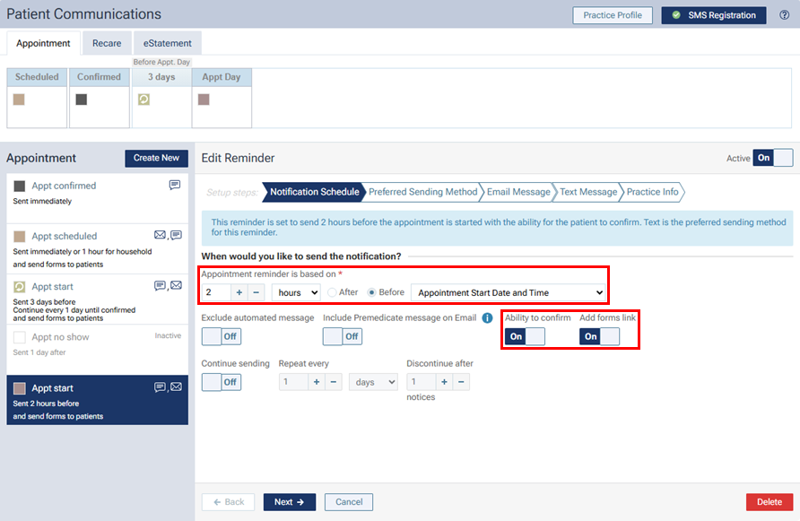 For eligible practices, a new two-hour “Appointment Start Date and Time” reminder has been added to your appointment reminder campaign. The intent of this new reminder is to improve patient form completion before appointments.