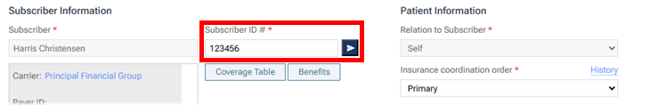 - If you are adding a patient’s primary insurance plan, specify at least the following information: Subscriber; Carrier, Payer ID, and Plan; and Subscriber ID #.