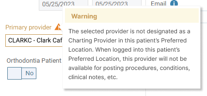 Dentrix Ascend now displays a warning message if the primary provider that you select for a patient is not designated as a charting provider in the patient’s preferred location. This warning lets you know that when you are logged in to the patient’s preferred location, the patient’s primary provider will not be available for selection when you enter conditions, treatment, clinical notes, and so forth.
